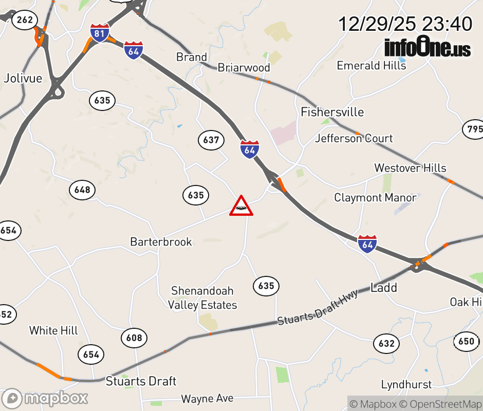 On Rt. 608 in the County of Augusta, in the vicinity of Augusta Farms Rd; Ramsey Rd; Rt. 635N/S (Augusta County), motorists can expect delays due to a vehicle crash. All south lanes are closed. ![]() |
