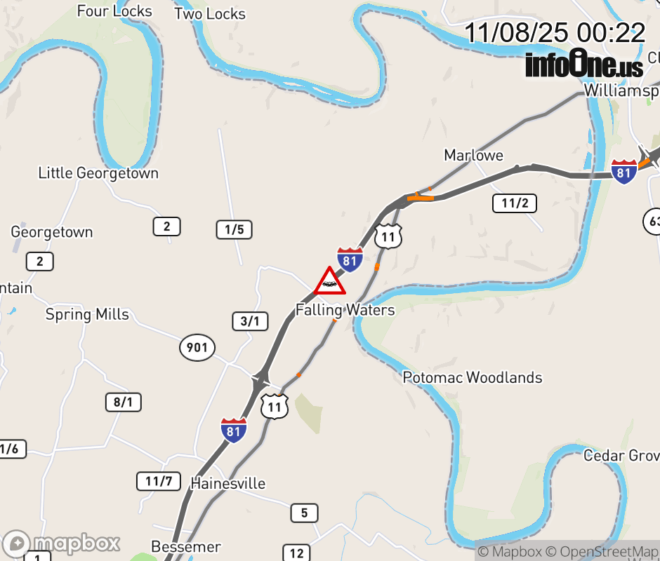 Vehicle Crash on I-81S at Mile Marker 22.0. Updated: Sat 11/8/25 12:22 AM EST ![]() Updated: Sat 11/8/25 12:22 AM EST |