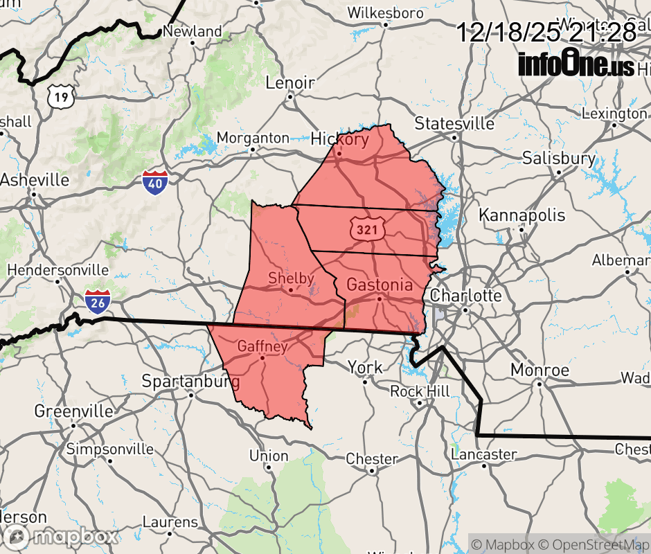 Canceled 12/19/25 1:17 AM Dense Fog Advisory issued December 18 at 9:27PM EST until December 19 at 3:00AM EST by NWS Greenville-Spartanburg SC * WHAT... Areas of visibility one quarter mile or less in dense fog. * WHERE... In North Carolina, Catawba, Cleveland, Gaston, and Lincoln Counties. In South Carolina, Cherokee County. * WHEN... Until 3 AM EST Friday. * IMPACTS... Low visibility could make driving conditions hazardous. ![]() |