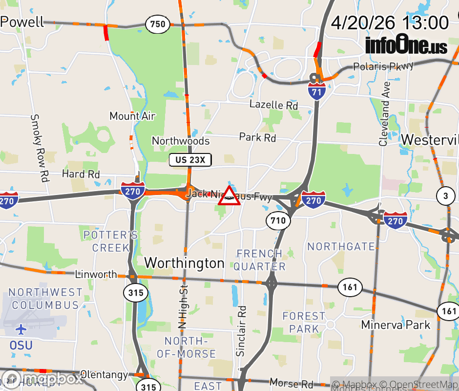 The right shoulder is blocked on I-270 East beyond US-23, due to a crash. Updated: Mon 4/20/26 1:00 PM EDT ![]() Updated: Mon 4/20/26 1:00 PM EDT |