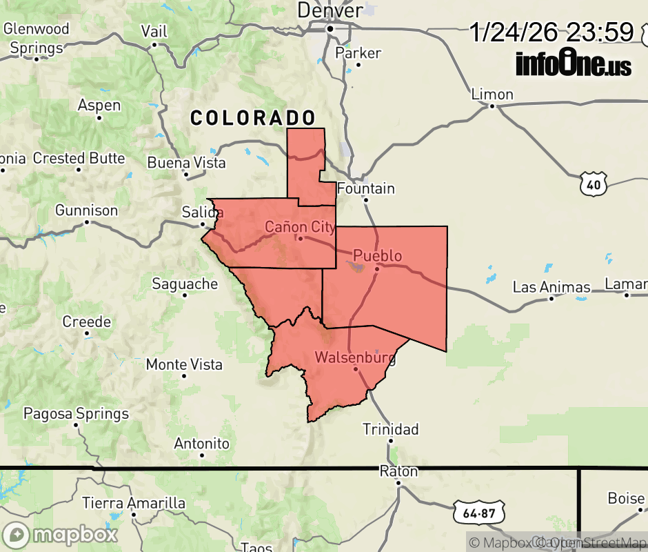 Canceled 1/25/26 4:53 AM Winter Weather Advisory issued January 24 at 9:58PM MST until January 25 at 5:00AM MST by NWS Pueblo CO * WHAT... Snow. Additional snow accumulations up to one inch. * WHERE... Pueblo, Canon City Vicinity/Eastern Fremont County, and Walsenburg Vicinity/Upper Huerfano River Basin Below 7500 Feet. * WHEN... Until 5 AM MST Sunday. * IMPACTS... Plan on slippery road conditions. ![]() |