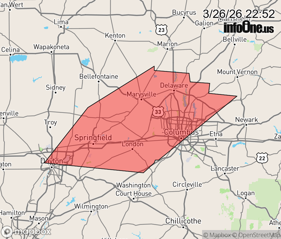 Canceled 3/26/26 11:30 PM Special Weather Statement issued March 26 at 10:50PM EDT by NWS Wilmington OH At 1050 PM EDT, strong thunderstorms were located along a line extending from near Prospect to near North Lewisburg to near Enon, moving east at 60 mph. HAZARD...Wind gusts up to 50 mph. SOURCE...Radar indicated. IMPACT...Gusty winds could knock down tree limbs and blow around unsecured objects. Locations impacted include... Columbus, Dayton, Springfield, Beavercreek, Dublin, Huber Heights, Westerville, Grove City, Delaware, Upper Arlington, Gahanna, Fairborn, Hilliard, Marysville, Vandalia, Worthington, Bexley, Urbana, London, and New Carlisle. ![]() |