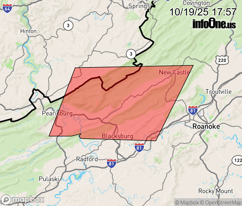 Canceled 10/19/25 6:30 PM Special Weather Statement issued October 19 at 5:56PM EDT by NWS Blacksburg VA At 555 PM EDT, Doppler radar was tracking a cluster of strong thunderstorms over Cascades, or over Mountain Lake, moving east at 45 mph. HAZARD...Wind gusts up to 40 mph. SOURCE...Radar indicated. IMPACT...Gusty winds could knock down tree limbs and blow around unsecured objects. Locations impacted include... Blacksburg... Pearisburg... Pembroke... New Castle... Newport... Sinking Creek... and Mountain Lake. ![]() |