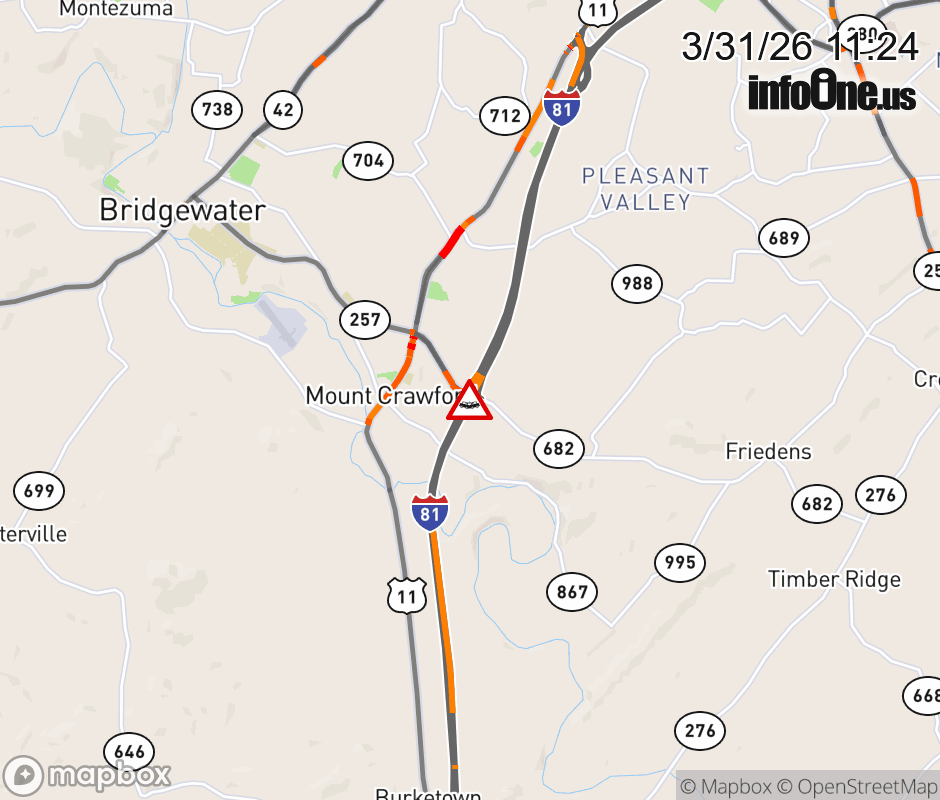 On I-81 North at mile marker 240 in the County of Rockingham, motorists can expect delays due to a tractor trailer crash. Traffic backups are approximately 5.0 miles. Updated: Tue 3/31/26 11:24 AM EDT ![]() Updated: Tue 3/31/26 11:24 AM EDT |