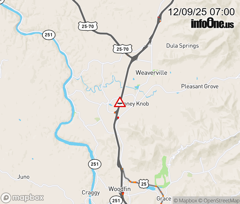 The right shoulder is closed one mile east of Exit 19, US 25/US 70. Updated: Tue 12/9/25 7:00 AM EST ![]() Updated: Tue 12/9/25 7:00 AM EST |