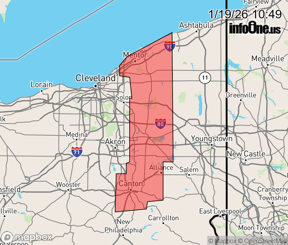 Canceled 1/19/26 11:30 AM Special Weather Statement issued January 19 at 10:48AM EST by NWS Cleveland OH At 1045 AM EST, radar indicated occasional snow showers along a line extending from near Willoughby to near Canton, moving east at 30 mph. HAZARDS INCLUDE... Winds to 35 mph... Visibility dropping to less than one quarters of a mile at times... Up to 1 inch of quick snow accumulation... Motorists traveling on Interstate 80, 90, and Route 2 should exercise caution and prepare to slow down. Locations impacted include... Canton, Painesville, Willowick, Ravenna, Chardon, Fairport Harbor, Mentor, Massillon, Kent, Green, Alliance, Willoughby, Eastlake, Tallmadge, North Canton, Streetsboro, Louisville, Mogadore, South Russell, and Minerva. Use extra caution if you must travel. Rapid changes in visibility and potentially slick roads may lead to accidents. ![]() |