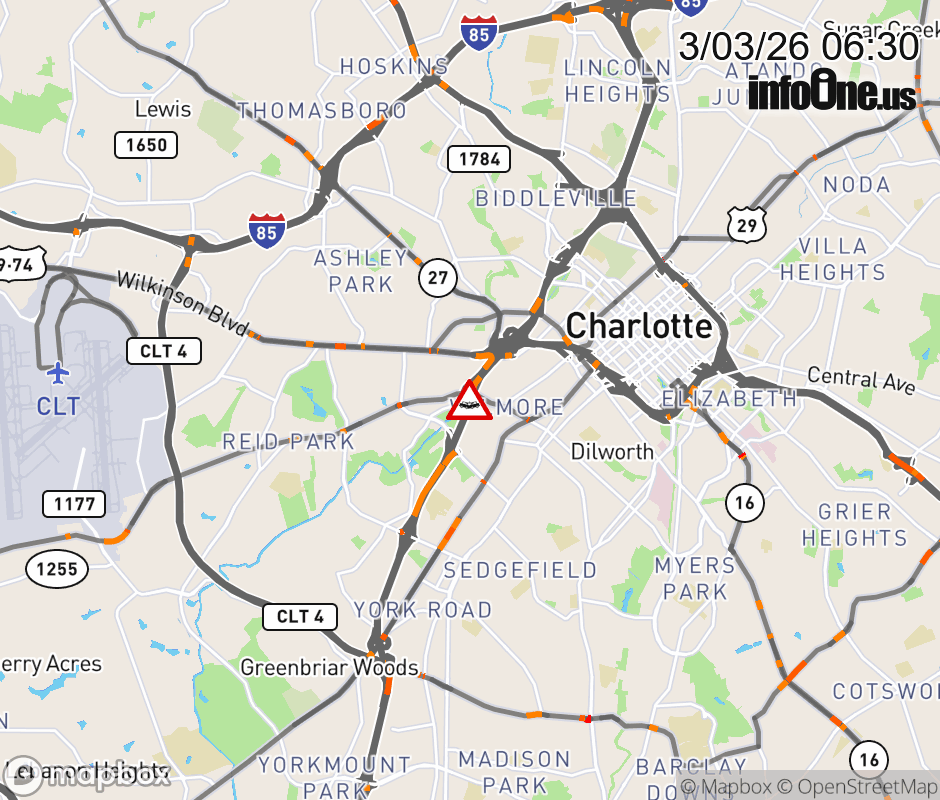The right lane is closed prior to Exit 9 (I-277). ![]() |