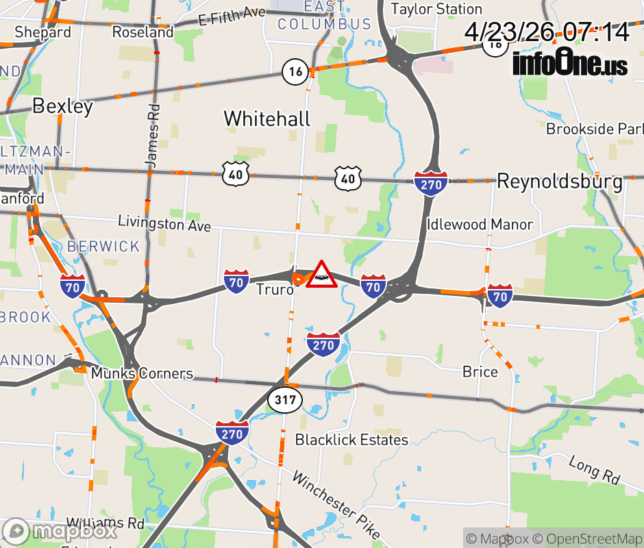 The right shoulder is blocked on I-70 East beyond SR-317 North/Hamilton Rd, due to a crash. Updated: Thu 4/23/26 7:14 AM EDT ![]() Updated: Thu 4/23/26 7:14 AM EDT |