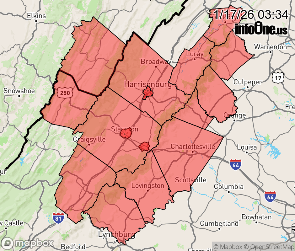 Canceled 1/17/26 9:00 AM Special Weather Statement issued January 17 at 3:32AM EST by NWS Baltimore MD/Washington DC * WHAT... Snow or a rain/snow mix; accumulations of a coating to an inch, mainly on grassy or elevated/untreated surfaces. * WHERE... Highland and Pendleton Counties, the central Shenandoah Valley, and the central and northern Virginia Blue Ridge. * WHEN... Through 9 AM this morning. * IMPACTS... Locally slippery roads and sidewalks are possible. * ADDITIONAL DETAILS... Visibility may locally be reduced to one mile or less. Accumulations are most likely at higher elevations. ![]() |