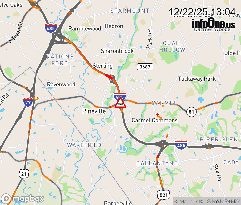 The two right lanes have reopened at Exit 64 (Pineville Matthews Rd.). Updated: Mon 12/22/25 1:04 PM EST ![]() Updated: Mon 12/22/25 1:04 PM EST |