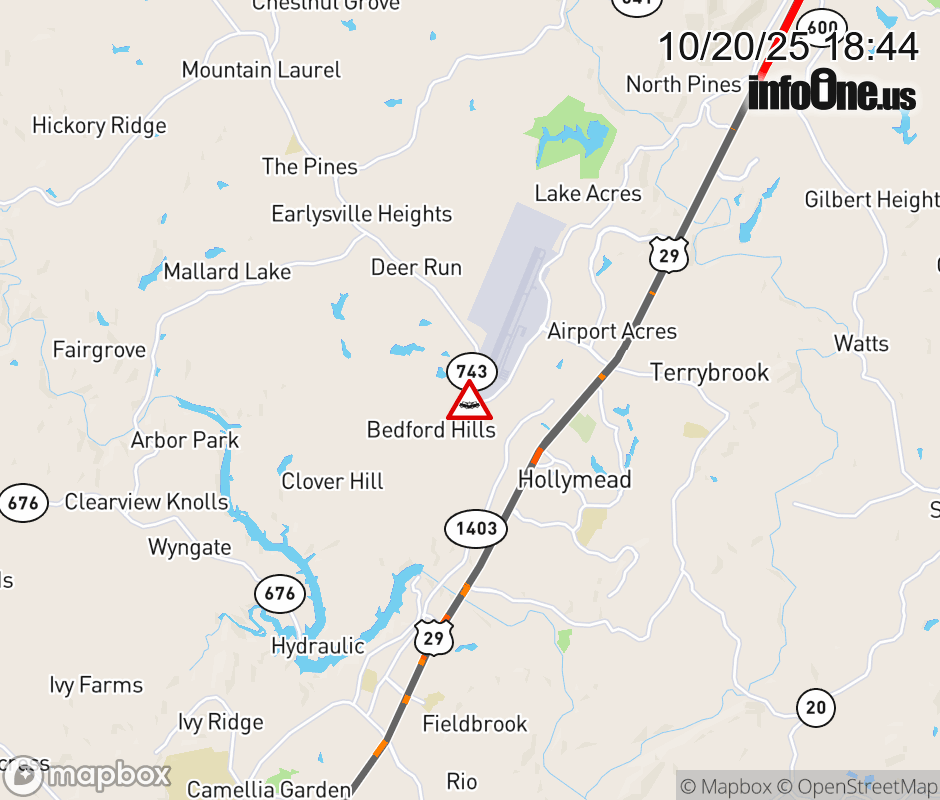On Rt. 743 in the County of Albemarle, in the vicinity of Dickerson Rd; Rt. 606N/S (Albemarle County), motorists can expect delays due to a vehicle crash. All north lanes are closed. All south lanes are closed. ![]() |