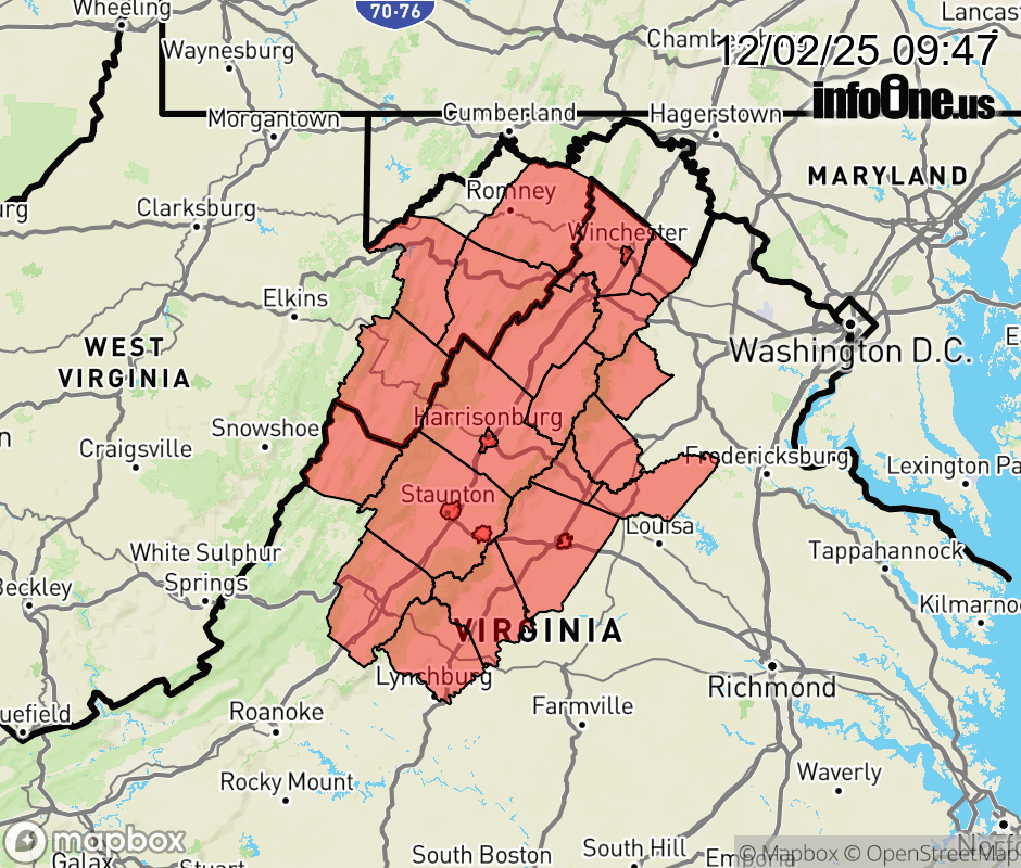Canceled 12/2/25 10:51 AM Winter Weather Advisory issued December 2 at 9:45AM EST until December 2 at 12:00PM EST by NWS Baltimore MD/Washington DC * WHAT... Freezing rain. Additional ice accumulations around a light glaze. * WHERE... Portions of central, northwest, and western Virginia and eastern West Virginia. * WHEN... Until noon EST today. * IMPACTS... Slippery sidewalks, roads and bridges are possible. ![]() |