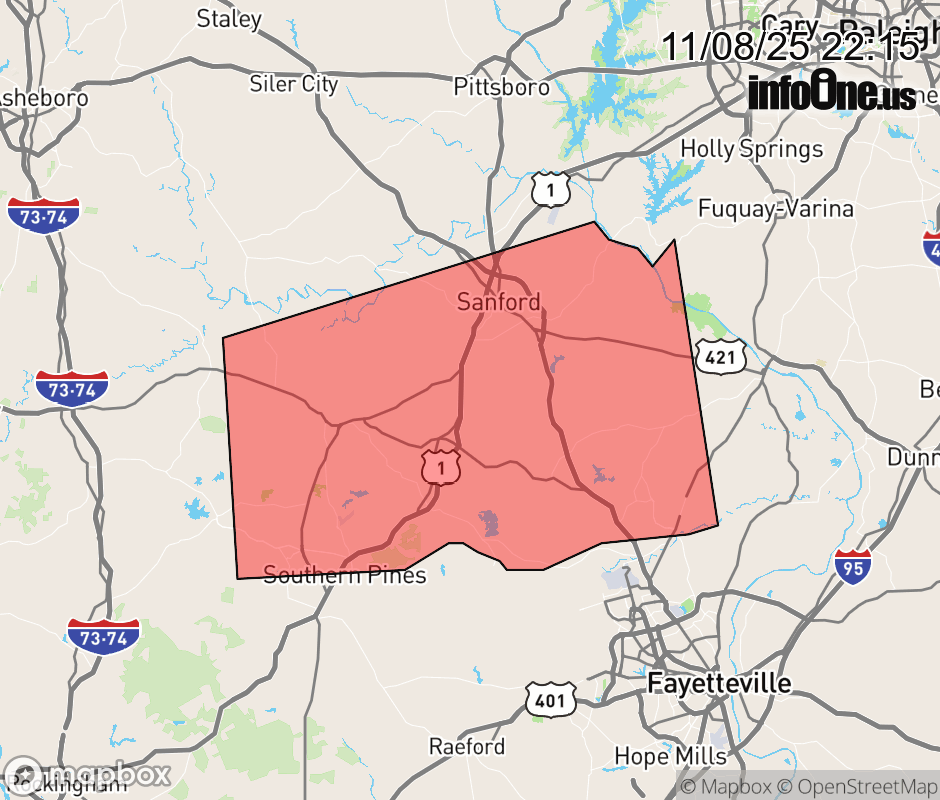 Canceled 11/8/25 11:15 PM Special Weather Statement issued November 8 at 10:14PM EST by NWS Raleigh NC At 1013 PM EST, Doppler radar was tracking a strong thunderstorm over Carthage, moving east at 30 mph. HAZARD...Wind gusts up to 40 mph and half inch hail. SOURCE...Radar indicated. IMPACT...Gusty winds could knock down tree limbs and blow around unsecured objects. Minor hail damage to vegetation is possible. Locations impacted include... Sanford, Southern Pines, Carthage, Pinehurst, Whispering Pines, Broadway, Taylortown, Vass, Cameron, and Lemon Springs. This includes US 1 between Mile Markers 69 and 71. ![]() |