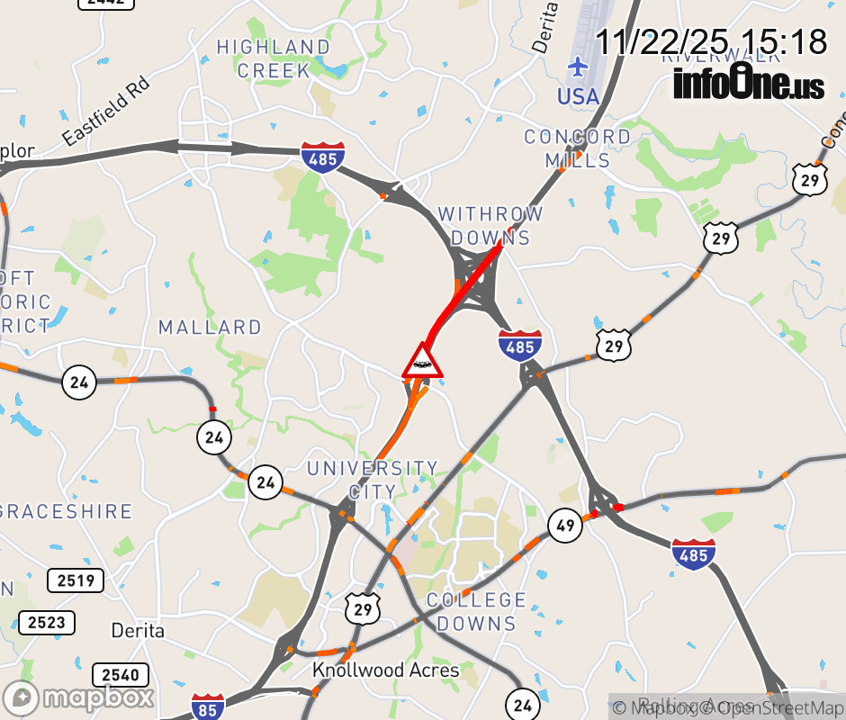 The right shoulder is closed past Exit 46 (W Mallard Creek Church Rd). Updated: Sat 11/22/25 3:18 PM EST ![]() Updated: Sat 11/22/25 3:18 PM EST |