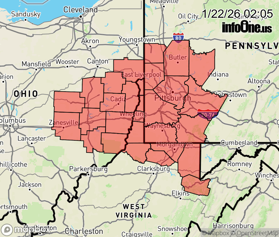 Canceled 1/22/26 4:59 AM Winter Storm Watch issued January 22 at 2:04AM EST until January 26 at 1:00PM EST by NWS Pittsburgh PA * WHAT... Moderate to major impacts to the region are possible later this weekend with periods of moderate to heavy snow. * WHERE... Portions of east central Ohio, southwest and western Pennsylvania, and northern and the northern panhandle of West Virginia. * WHEN... From Saturday evening through Monday afternoon. * IMPACTS... Travel could be very difficult to impossible later this weekend and Monday morning. ![]() |
