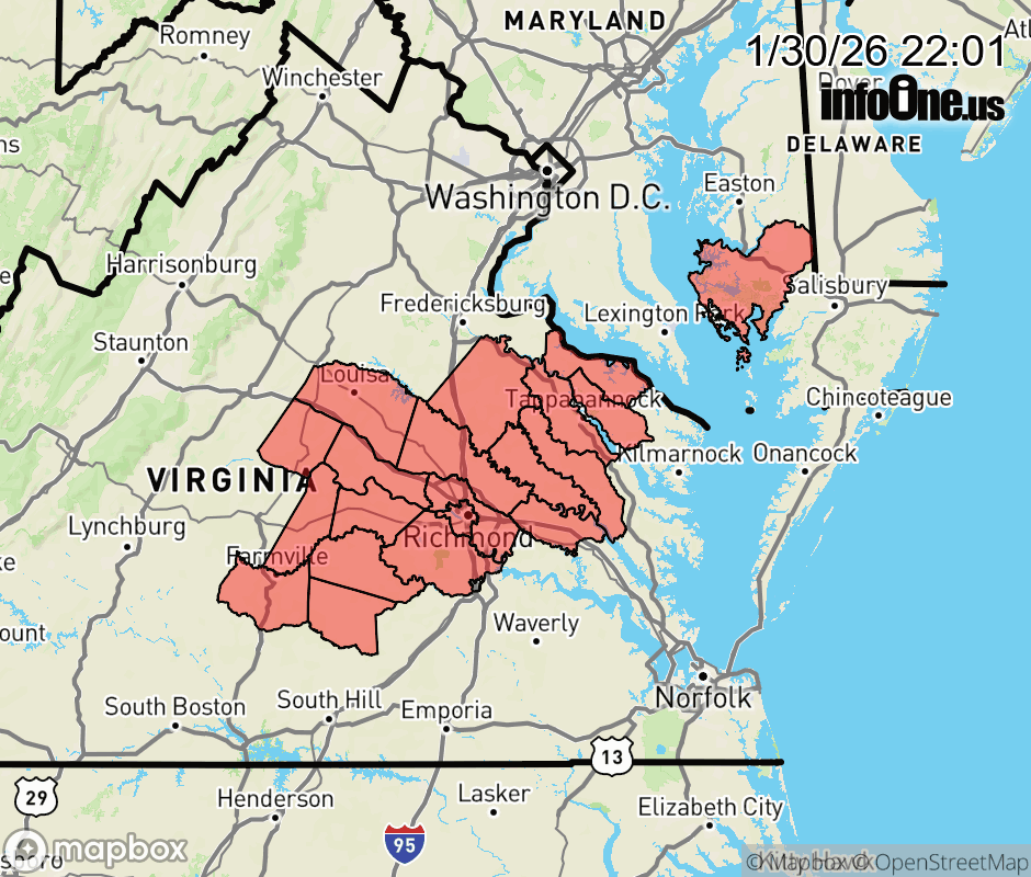 Canceled 1/31/26 12:52 AM Cold Weather Advisory issued January 30 at 9:59PM EST until February 1 at 1:00AM EST by NWS Wakefield VA * WHAT... For the Cold Weather Advisory, very cold wind chills as low as zero expected. For the Extreme Cold Watch, dangerously cold wind chills as low as 5 below possible. * WHERE... Portions of southeast Maryland and central, east central, north central, and south central Virginia. * WHEN... For the Cold Weather Advisory, from 1 AM Saturday to 1 AM EST Sunday. For the Extreme Cold Watch, from late Saturday night through Sunday morning. * IMPACTS... The cold wind chills as low as 5 below zero could result in hypothermia if precautions are not taken. ![]() |