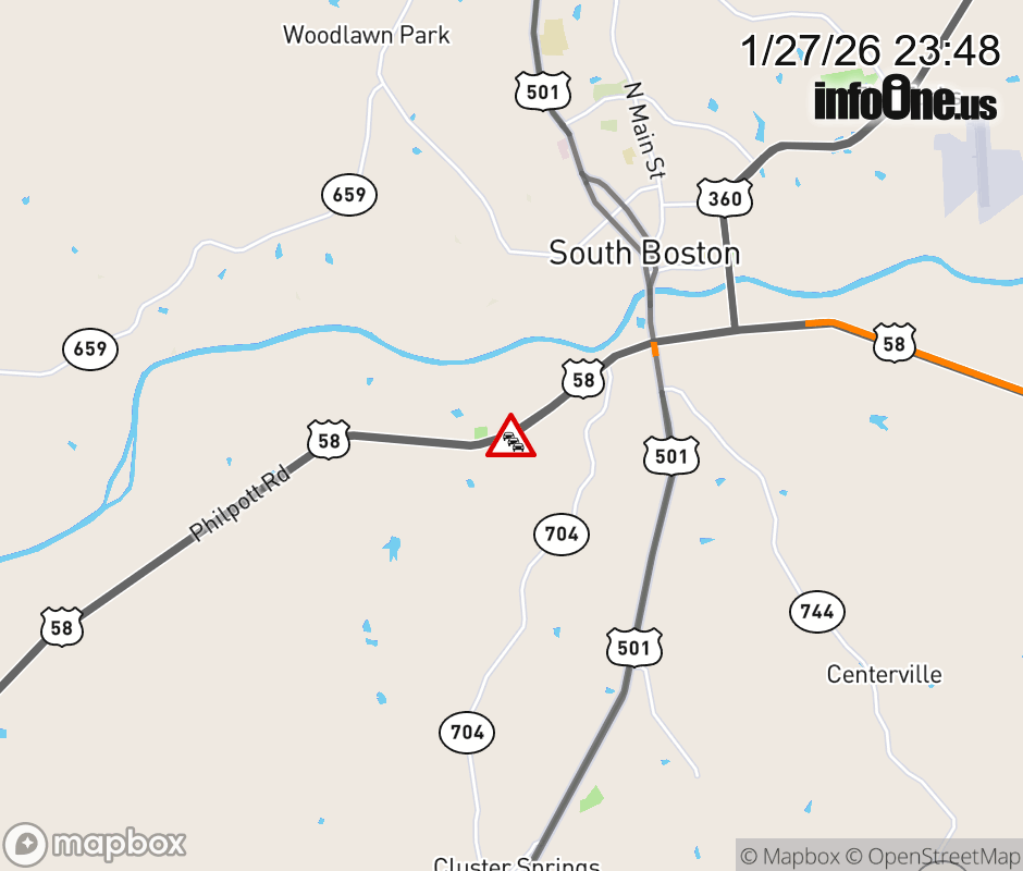 On US-58 in the County of Halifax, in the vicinity of Industrial Park Rd; Rt. 931N/S (Halifax County), motorists can expect delays due to an incident. The east right lane and right shoulder are closed. ![]() |