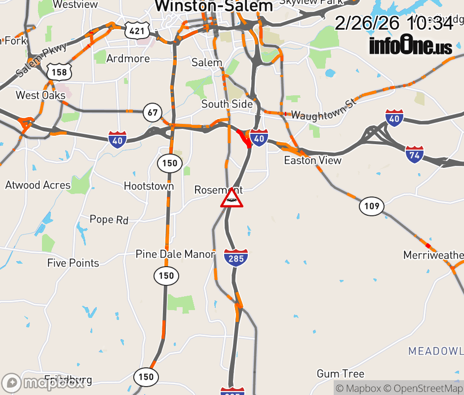The right lane is closed prior to Exit 105 (Clemmonsville Updated: Thu 2/26/26 10:34 AM EST ![]() Updated: Thu 2/26/26 10:34 AM EST |