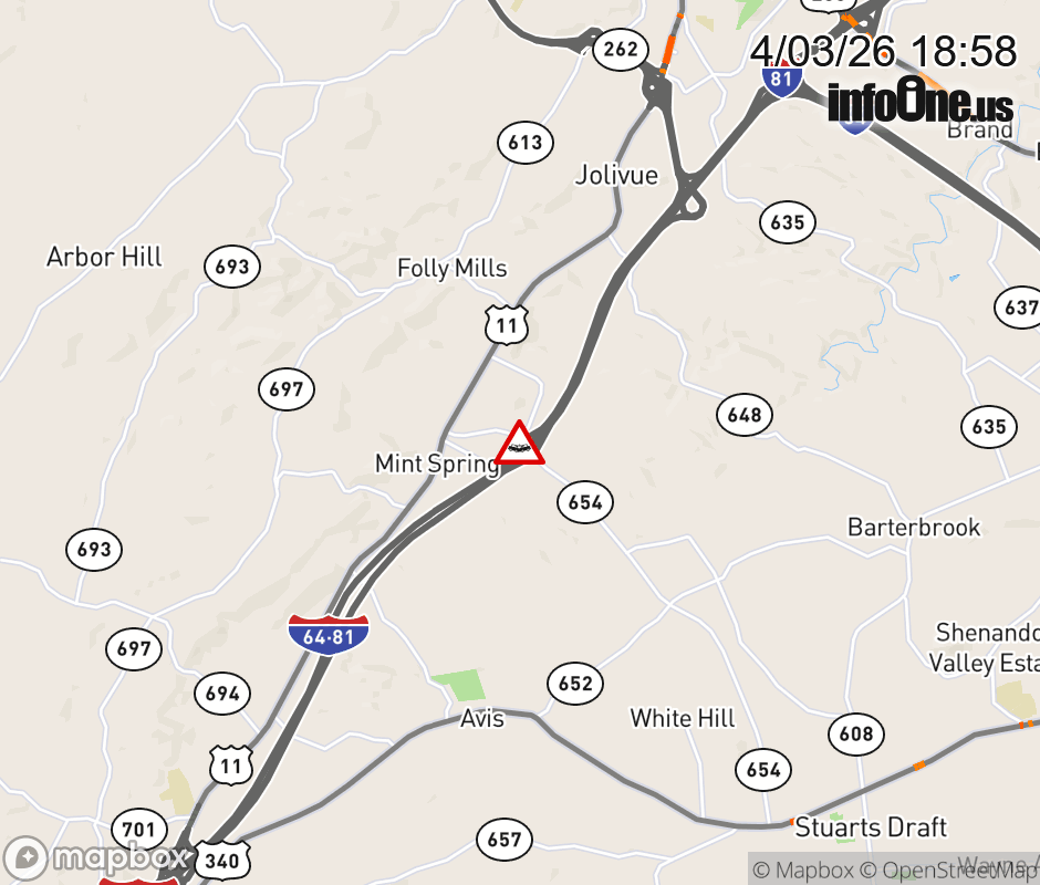 On Rt. 654 in the County of Augusta, in the vicinity of the ramp from and to I-81S, motorists can expect delays due to a vehicle crash. All east lanes are closed. All west lanes are closed. Updated: Fri 4/3/26 6:58 PM EDT ![]() Updated: Fri 4/3/26 6:58 PM EDT |