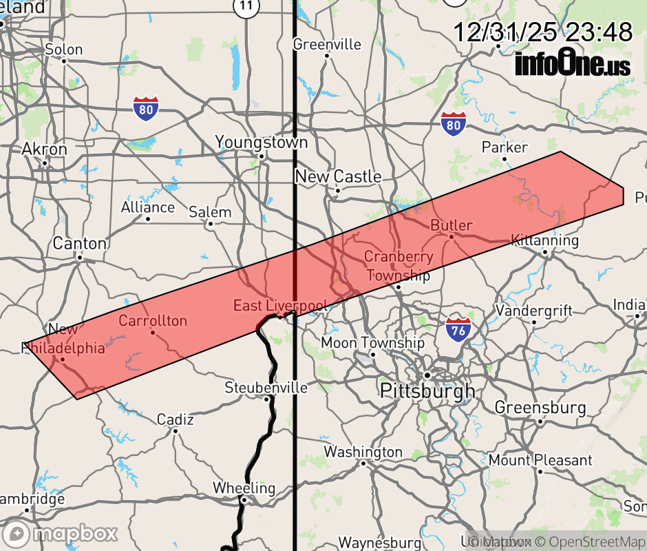 Canceled 1/1/26 12:08 AM Snow Squall Warning issued December 31 at 11:47PM EST until January 1 at 12:15AM EST by NWS Pittsburgh PA At 1147 PM EST, a dangerous snow squall was located along a line from over Rimersburg to over New Philadelphia, moving southeast at 20 mph. HAZARD...Intense bursts of heavy snow and gusty winds leading to blowing snow and rapidly falling visibility. Wind gusts up to 30 mph. SOURCE...Radar indicated. IMPACT...Travel will become difficult and potentially dangerous within minutes. Locations impacted include... Cranberry, New Philadelphia, Butler, Dover, East Liverpool, Beaver Falls, Monaca, Uhrichsville, Wellsville, Carrollton, Rimersburg, Ellwood City, Homeacre-Lyndora, New Brighton, Shanor-Northvue, Beaver, Calcutta, Meridian, Zelienople and Rochester. This includes the following highways... Interstate 77 in Ohio between mile markers 79 and 86. Interstate 79 in Pennsylvania between mile markers 83 and 97. Interstate 376 between mile markers 25 and 39. Pennsylvania Turnpike between mile markers 8 and 25. ![]() |