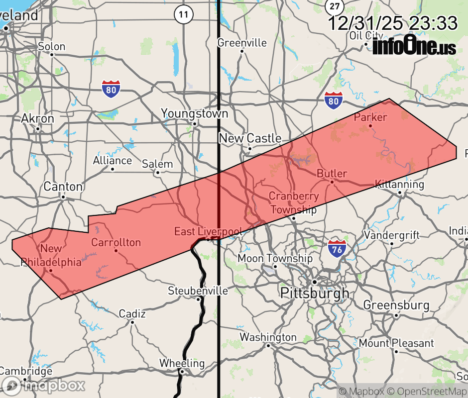 Canceled 12/31/25 11:48 PM Snow Squall Warning issued December 31 at 11:32PM EST until January 1 at 12:15AM EST by NWS Pittsburgh PA The National Weather Service in Pittsburgh has issued a * Snow Squall Warning for... Carroll County in east central Ohio... Columbiana County in east central Ohio... Northern Harrison County in east central Ohio... Northwestern Jefferson OH County in east central Ohio... Northern Tuscarawas County in east central Ohio... Northern Armstrong County in west central Pennsylvania... Butler County in west central Pennsylvania... Southern Clarion County in west central Pennsylvania... Northern Beaver County in western Pennsylvania... Southern Lawrence County in western Pennsylvania... * Until 1215 AM EST. * At 1132 PM EST, a dangerous snow squall was located along a line from 6 miles northwest of Rimersburg to over Strasburg, or along a line from 6 miles northwest of Rimersburg to over Dover, moving southeast at 20 mph. HAZARD...Intense bursts of heavy snow and gusty winds leading to blowing snow and rapidly falling visibility. Wind gusts up to 35 mph. SOURCE...Radar indicated. IMPACT...Travel will become difficult and potentially dangerous within minutes. * Locations impacted include... Cranberry, New Philadelphia, Butler, Dover, East Liverpool, Beaver Falls, Columbiana, Monaca, Uhrichsville, East Palestine, Wellsville, Carrollton, Rimersburg, Ellwood City, Homeacre-Lyndora, New Brighton, Shanor-Northvue, Beaver, Calcutta and Meridian. This includes the following highways... Interstate 77 in Ohio between mile markers 79 and 94. Interstate 80 in Pennsylvania between mile markers 49 and 54. Interstate 79 in Pennsylvania between mile markers 83 and 105. Interstate 376 between mile markers 19 and 39. Pennsylvania Turnpike between mile markers 2 and 24. ![]() |
