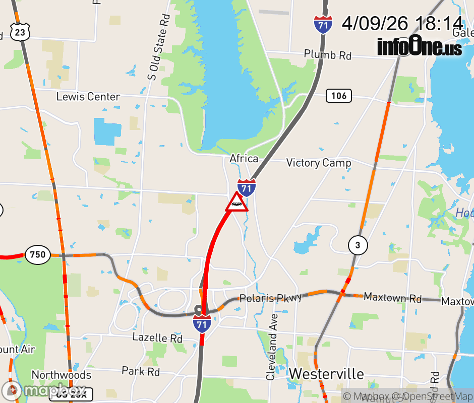 The right shoulder is blocked on I-71 North beyond Polaris Pkwy/Gemini Place, due to a crash. Updated: Thu 4/9/26 6:14 PM EDT ![]() Updated: Thu 4/9/26 6:14 PM EDT |