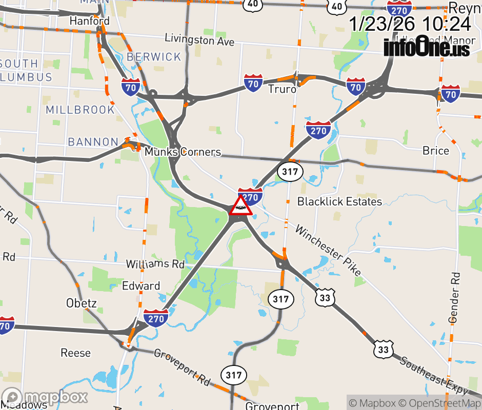 Ramp I-270 South to US-33 West CLOSED because of a crash. Updated: Fri 1/23/26 10:24 AM EST ![]() Updated: Fri 1/23/26 10:24 AM EST |
