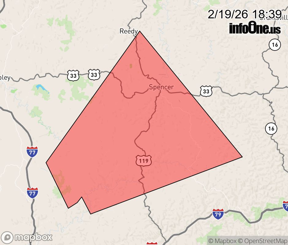 Canceled 2/19/26 6:44 PM Severe Thunderstorm Warning issued February 19 at 6:38PM EST until February 19 at 7:00PM EST by NWS Charleston WV At 638 PM EST, a severe thunderstorm was located 10 miles southwest of Spencer, moving northeast at 35 mph. HAZARD...60 mph wind gusts and quarter size hail. SOURCE...Radar indicated. IMPACT...Hail damage to vehicles is expected. Expect wind damage to roofs, siding, and trees. Locations impacted include... Spencer, Kentuck, Looneyville, Harmony, Walton, and Gandeeville. ![]() |