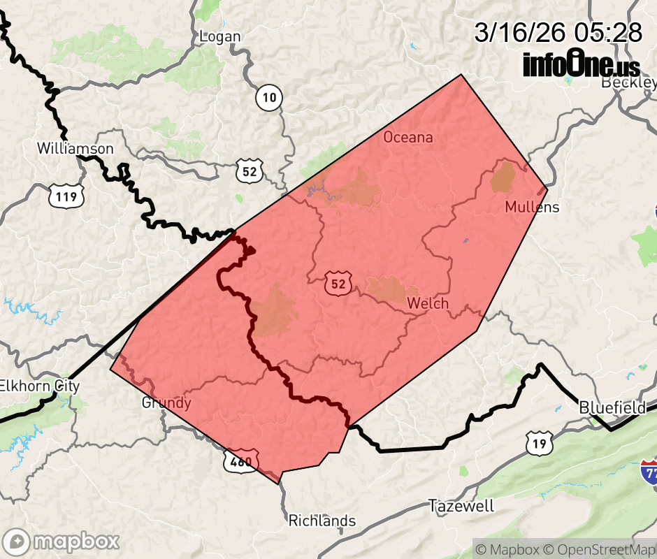 Canceled 3/16/26 5:48 AM Severe Thunderstorm Warning issued March 16 at 5:26AM EDT until March 16 at 6:15AM EDT by NWS Charleston WV SVRRLX The National Weather Service in Charleston West Virginia has issued a * Severe Thunderstorm Warning for... Central Buchanan County in southwestern Virginia... McDowell County in southern West Virginia... Southeastern Mingo County in southern West Virginia... Wyoming County in southern West Virginia... * Until 615 AM EDT. * At 526 AM EDT, severe thunderstorms were located along a line extending from near Hinch to near Paw Paw to near Grundy, moving east at 40 mph. HAZARD...60 mph wind gusts. SOURCE...Radar indicated. IMPACT...Expect damage to roofs, siding, and trees. * Locations impacted include... Welch, Grundy, Pineville, Mullens, Oceana, Gary, War, Hanover, R.d. Bailey Lake, Gilbert Creek, Twin Falls State Park, Davy, Bradshaw, Iaeger, Kimball, Coal Mountain, Jolo, Coalwood, Hurley, and Avondale. ![]() |
