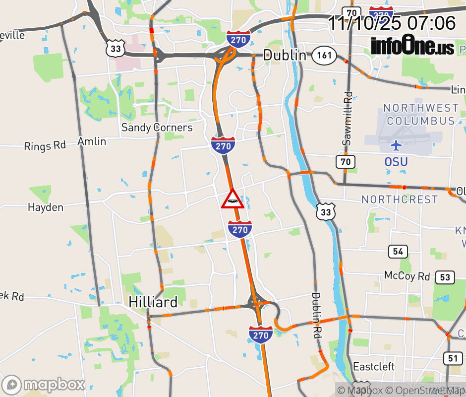 The 2 right lanes are blocked on I-270 South beyond Tuttle Crossing Blvd, due to a crash. Updated: Mon 11/10/25 7:06 AM EST ![]() |