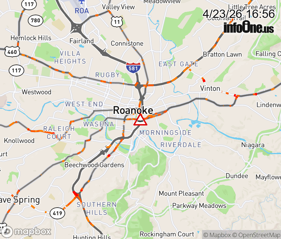 On I-581 at mile marker 0 in the City of Roanoke, motorists can expect delays due to a vehicle crash. The north entrance ramp narrows. ![]() |