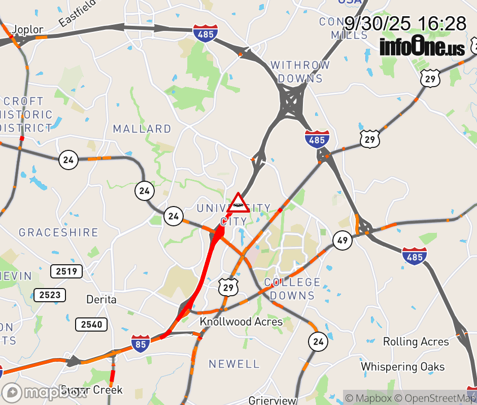 The right shoulder is closed past Exit 45 (W W. T. Harris Blvd). Updated: Tue 9/30/25 4:28 PM EDT ![]() Updated: Tue 9/30/25 4:28 PM EDT |