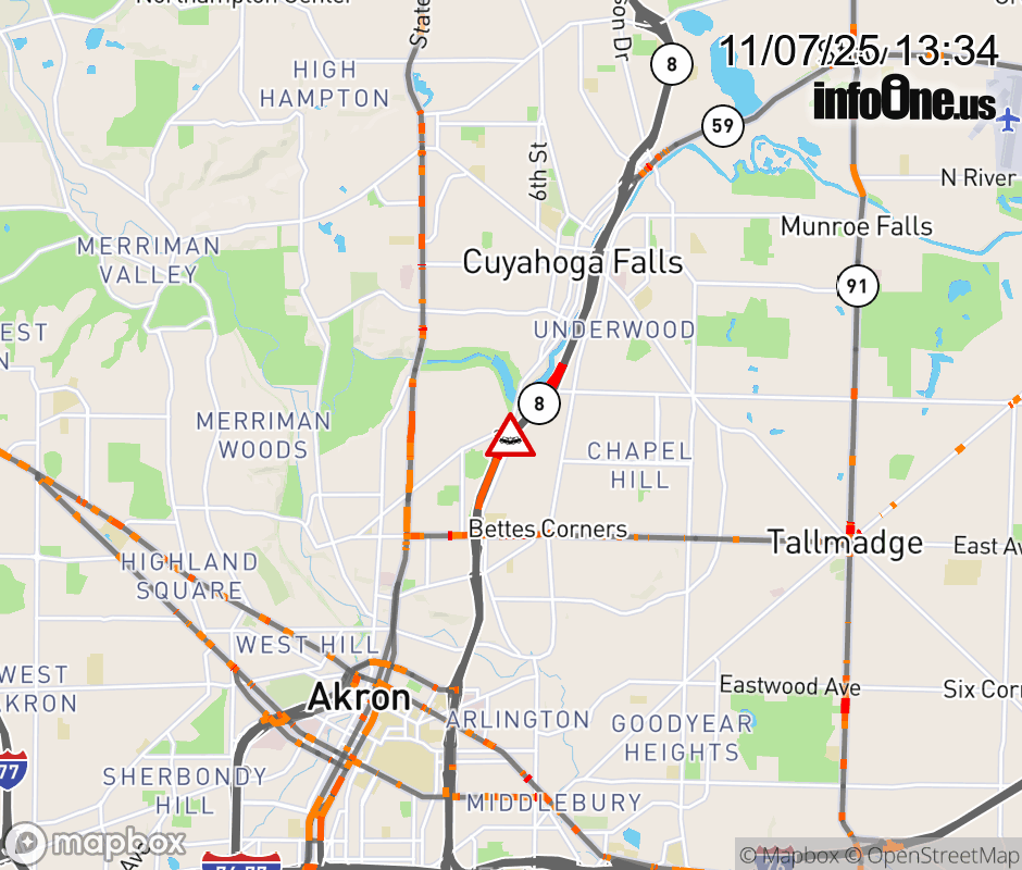 The right lane is blocked on SR-8 North/SR-59 East beyond Cuyahoga Falls Ave, due to a crash. Updated: Fri 11/7/25 1:34 PM EST ![]() Updated: Fri 11/7/25 1:34 PM EST |