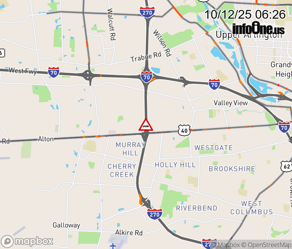 Ramp to US-40/W Broad St West from I-270 South is blocked due to disabled vehicle. Updated: Sun 10/12/25 6:26 AM EDT ![]() |