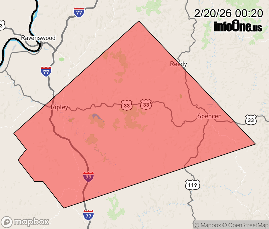 Canceled 2/20/26 12:30 AM Severe Thunderstorm Warning issued February 20 at 12:19AM EST until February 20 at 12:30AM EST by NWS Charleston WV At 1218 AM EST, a severe thunderstorm was located near Ripley, moving northeast at 45 mph. HAZARD...Quarter size hail. SOURCE...Radar indicated. IMPACT...Damage to vehicles is expected. Locations impacted include... Ripley, Spencer, Kenna, Reedy, Statts Mills, Given, Leroy, Fairplain, and Gay. ![]() |