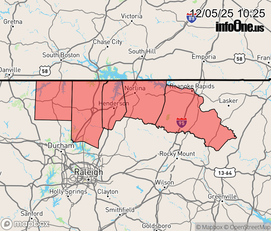 Canceled 12/5/25 11:48 AM Winter Weather Advisory issued December 5 at 10:23AM EST until December 5 at 12:00PM EST by NWS Raleigh NC * WHAT... Total snow accumulations up to one inch are still possible. * WHERE... Granville, Halifax, Person, Vance, and Warren Counties. * WHEN... Until noon EST today. * IMPACTS... Plan on slippery road conditions. ![]() |