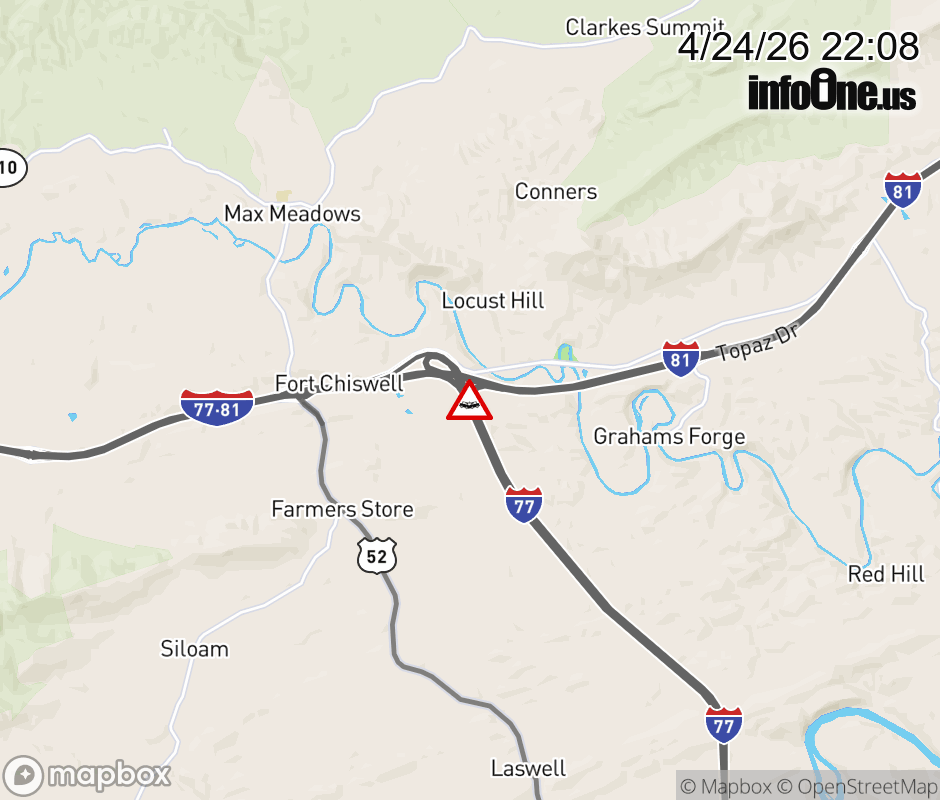 On I-77 at mile marker 32 in the County of Wythe, motorists can expect delays due to a vehicle crash. The north right shoulder is closed. ![]() |