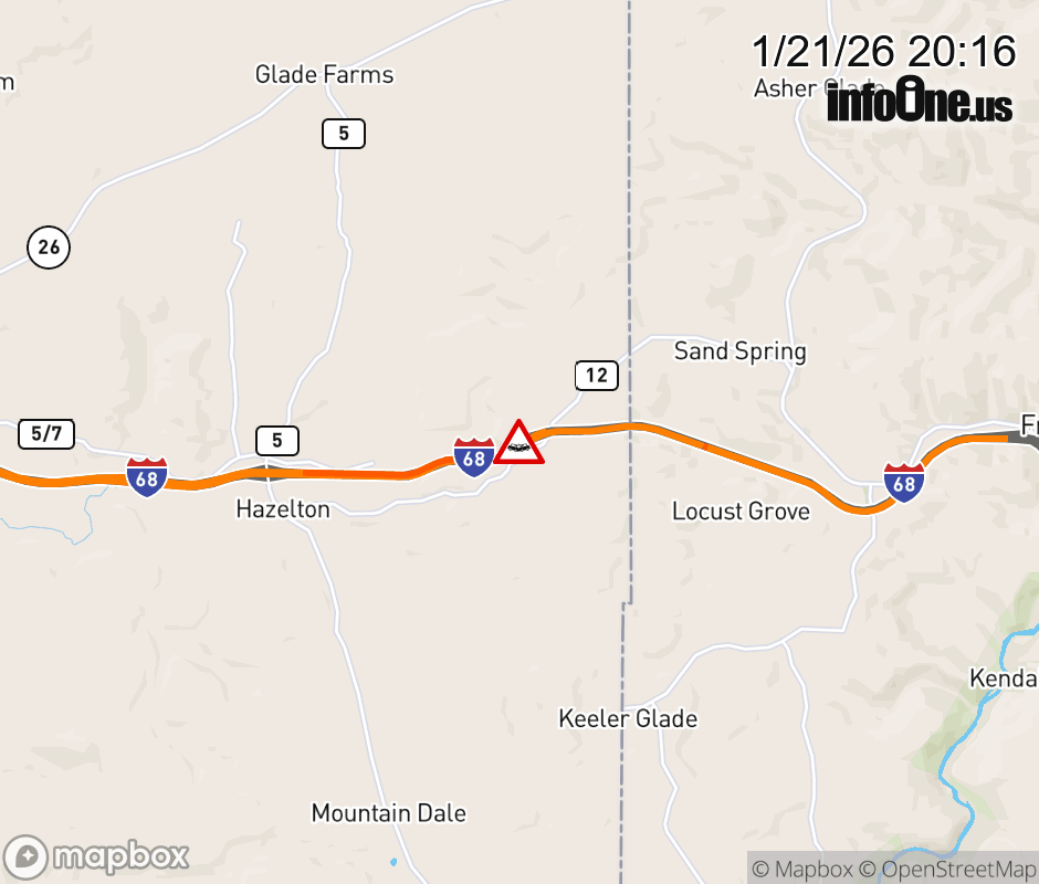 Canceled 1/21/26 10:26 PM Location: I-68 at MM 0.0, WV Accident.