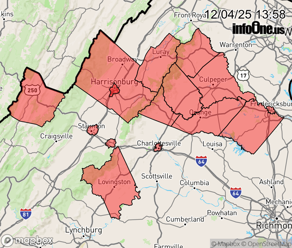 Canceled 12/4/25 9:35 PM Winter Weather Advisory issued December 4 at 1:56PM EST until December 5 at 4:00PM EST by NWS Baltimore MD/Washington DC ...SOME SNOW AND VERY COLD TEMPERATURES WILL RESULT IN TREACHEROUS TRAVEL FOR THE FRIDAY MORNING COMMUTE... .A combination of light snow and very cold temperatures will result in treacherous travel Friday morning. The morning commute will be impacted, with slick and icy roads and sidewalks expected. * WHAT... Snow, with total accumulations of 1 and 3 inches. Localized totals around 4 inches are possible over the higher elevations of Highland and Augusta Counties. * WHERE... Portions of central, northern, northwest, and western Virginia. * WHEN... From 1 AM to 4 PM EST Friday. * IMPACTS... Plan on slippery road conditions. The hazardous conditions will impact the Friday morning commute. * ADDITIONAL DETAILS... Given temperatures will be in the 20s, snow is expected to accumulate on all untreated surfaces. A light snow will overspread the advisory area, with slightly higher amounts possible in any banding features. As snow winds down, a light freezing drizzle is possible into Friday afternoon. ![]() |