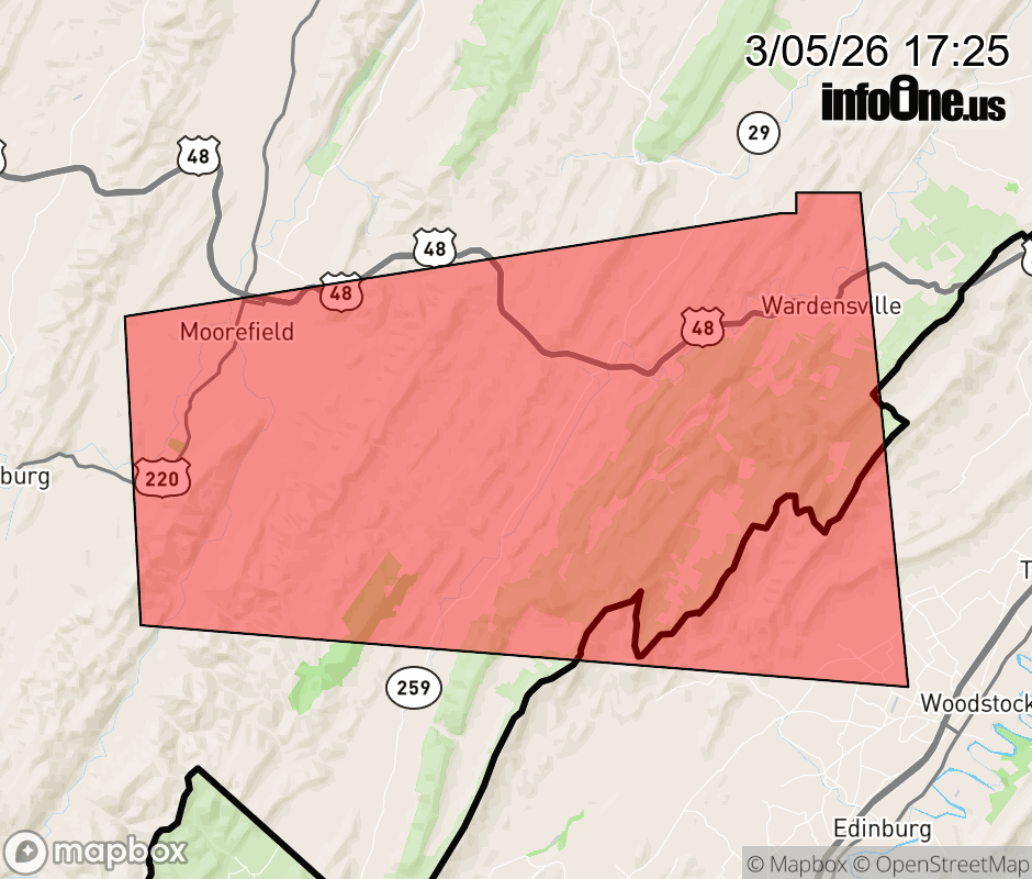 Canceled 3/5/26 5:31 PM Severe Thunderstorm Warning issued March 5 at 5:24PM EST until March 5 at 6:00PM EST by NWS Baltimore MD/Washington DC SVRLWX The National Weather Service in Sterling Virginia has issued a * Severe Thunderstorm Warning for... Northwestern Shenandoah County in northwestern Virginia... Central Hardy County in eastern West Virginia... * Until 600 PM EST. * At 523 PM EST, a severe thunderstorm was located near Moorefield, moving east at 35 mph. HAZARD...60 mph wind gusts and quarter size hail. SOURCE...Radar indicated. IMPACT...Damaging winds will cause some trees and large branches to fall. This could injure those outdoors, as well as damage homes and vehicles. Roadways may become blocked by downed trees. Localized power outages are possible. Unsecured light objects may become projectiles. * Locations impacted include... Moorefield, Wardensville, Lost City, Perry, Lost River, Fisher, Baker, and Mccauley. ![]() |