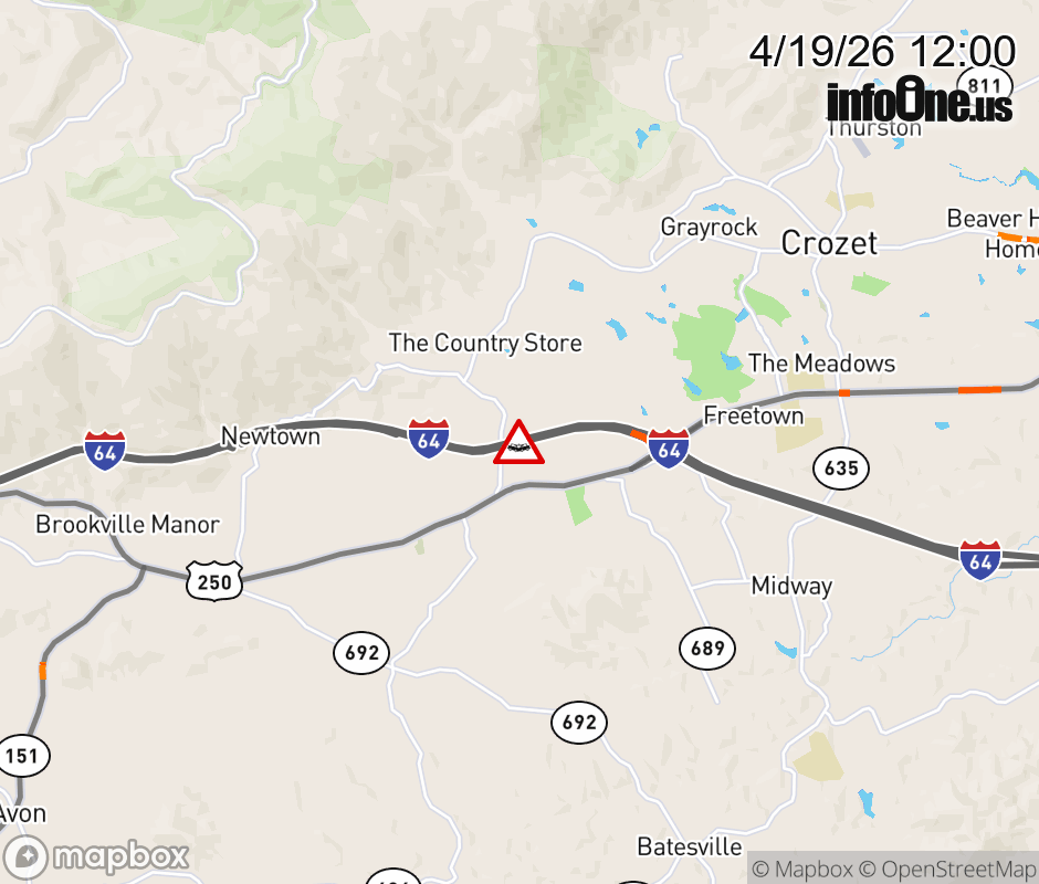 On I-64 at mile marker 106.2 in the County of Albemarle, motorists can expect delays due to a vehicle crash. The east right shoulder is closed. ![]() |