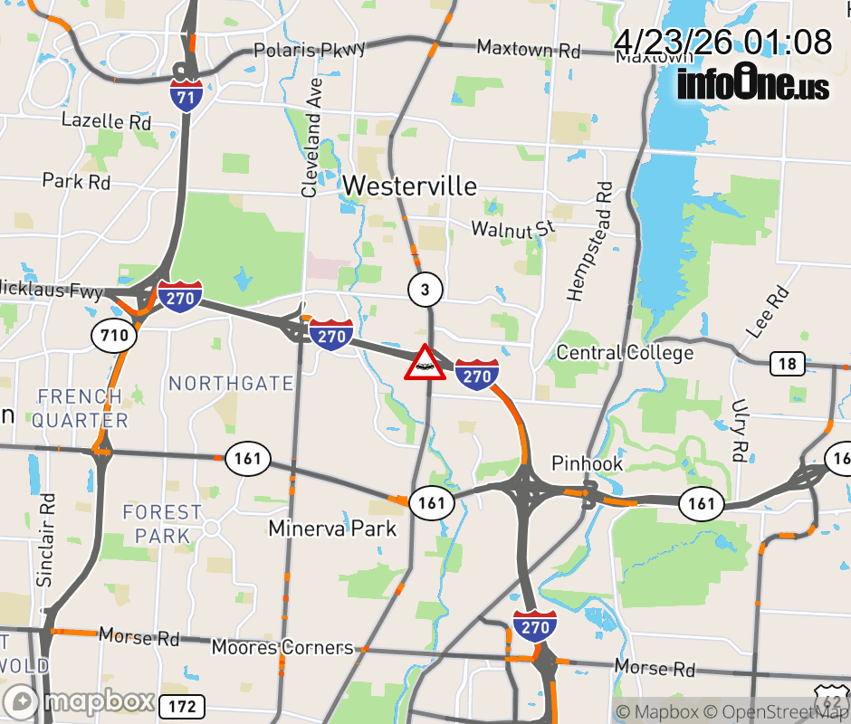 All lanes are closed on I-270 East beyond SR-3/Westerville Pike, due to a crash. Updated: Thu 4/23/26 1:08 AM EDT ![]() Updated: Thu 4/23/26 1:08 AM EDT |