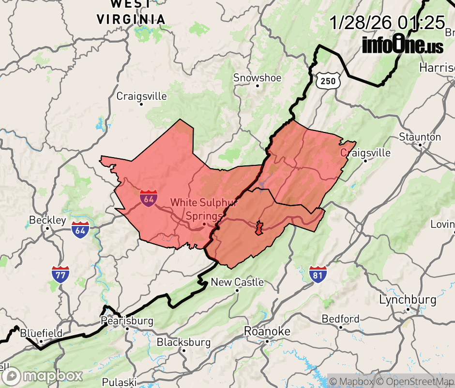 Canceled 1/28/26 11:00 AM Cold Weather Advisory issued January 28 at 1:24AM EST until January 28 at 11:00AM EST by NWS Blacksburg VA * WHAT... For the first Cold Weather Advisory, very cold wind chills as low as 10 below through this morning. For the second Cold Weather Advisory, very cold wind chills as low as 10 below tonight. * WHERE... In Virginia, Alleghany VA and Bath Counties. In West Virginia, Eastern Greenbrier and Western Greenbrier Counties. * WHEN... For the first Cold Weather Advisory, until 11 AM EST this morning. For the second Cold Weather Advisory, from 7 PM this evening to 11 AM EST Thursday. * IMPACTS... The cold wind chills as low as 10 below zero could result in hypothermia or frostbite if precautions are not taken. ![]() |