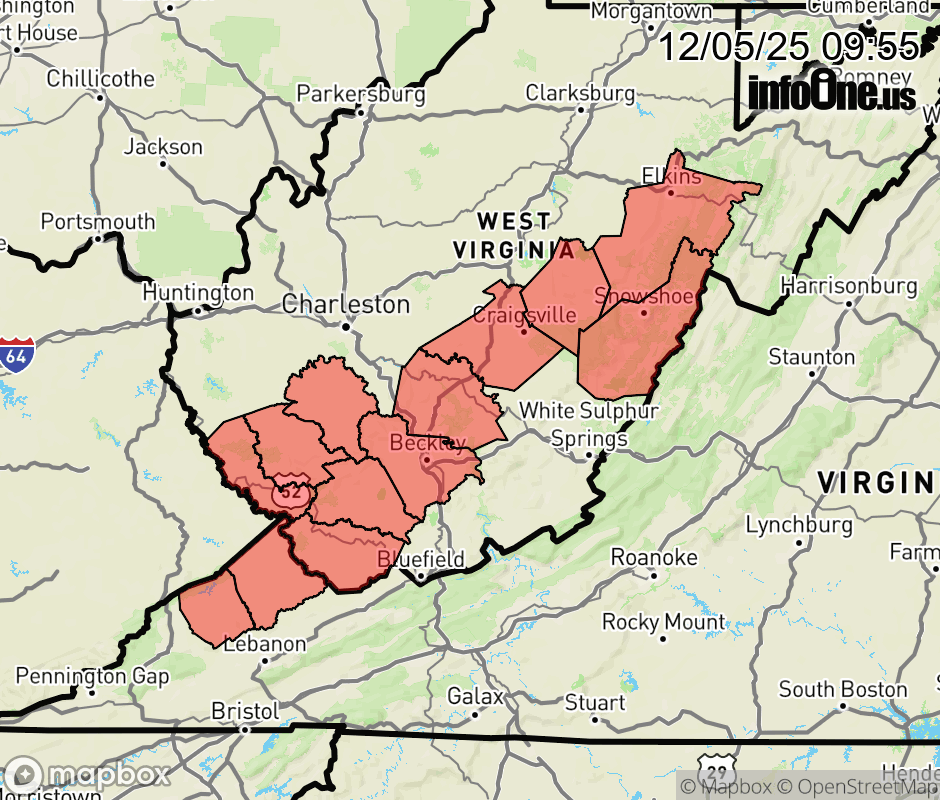 Canceled 12/5/25 12:00 PM Special Weather Statement issued December 5 at 9:54AM EST by NWS Charleston WV Areas of light snow will persist in the mountains and southern coalfields through around midday. While additional accumulations should be minimal, this may allow for slick road conditions to continue, especially on any untreated roadways. Allow extra time to reach your destination and be prepared for slick roads. ![]() |
