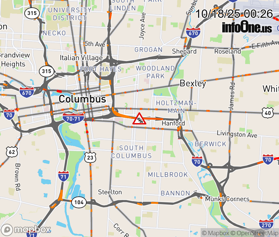 The 3 right lanes are blocked on I-70 East at Miller Ave/Kelton Ave, due to repairs/maintenance. Updated: Sat 10/18/25 12:26 AM EDT ![]() Updated: Sat 10/18/25 12:26 AM EDT |