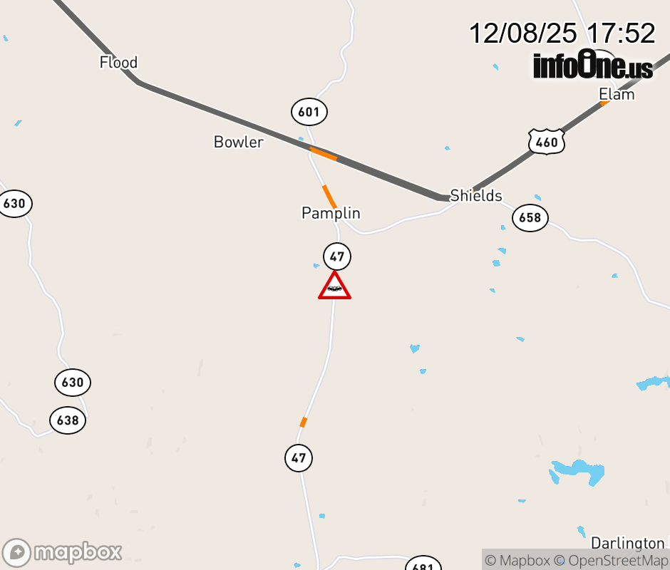 On VA-47 South in the County of Appomattox, in the vicinity of Point Rd; Rt. 725N/S (Appomattox County); County/City/Town Line: CHARLOTTE - APPOMATTOX COUNTY LINE, motorists can expect delays due to a tractor trailer crash. Lane closures exist. ![]() |