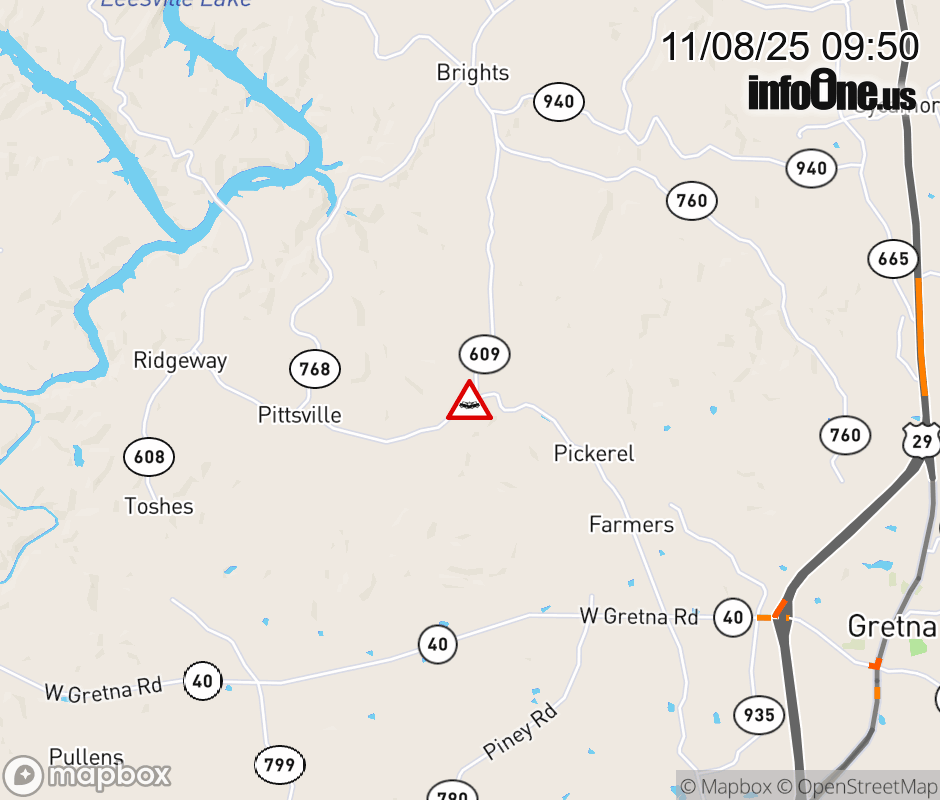 On Rt. 672 in the County of Pittsylvania, in the vicinity of Brights Rd; Rt. 609N/S (Pittsylvania County), motorists can expect delays due to a vehicle crash. All north lanes are closed. All south lanes are closed. ![]() |