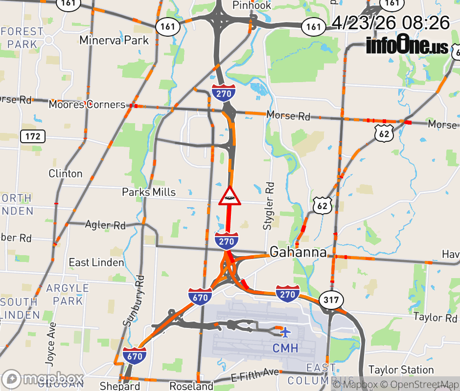 The right shoulder is blocked on I-270 North beyond US-62 East/Johnstown Rd, due to a crash. Updated: Thu 4/23/26 8:26 AM EDT ![]() Updated: Thu 4/23/26 8:26 AM EDT |