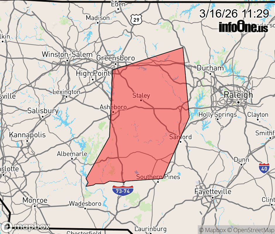 Canceled 3/16/26 11:30 AM Severe Thunderstorm Warning issued March 16 at 11:28AM EDT until March 16 at 11:30AM EDT by NWS Raleigh NC The storms which prompted the warning have weakened below severe limits, and no longer pose an immediate threat to life or property. Therefore, the warning will be allowed to expire. However, gusty winds to 50 mph are still possible with these thunderstorms. A Tornado Watch remains in effect until 200 PM EDT for central North Carolina. ![]() |
