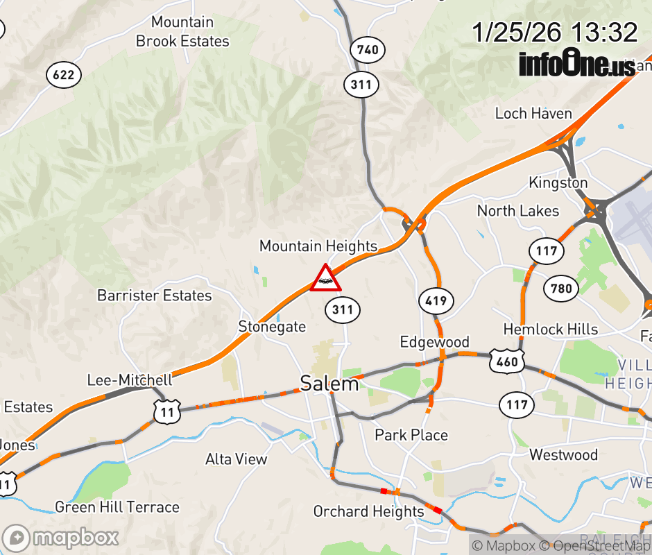 On I-81 at mile marker 140.2 in the County of Roanoke, motorists can expect delays due to a tractor trailer crash. The north left shoulder and left lane are closed. Updated: Sun 1/25/26 1:32 PM EST ![]() |